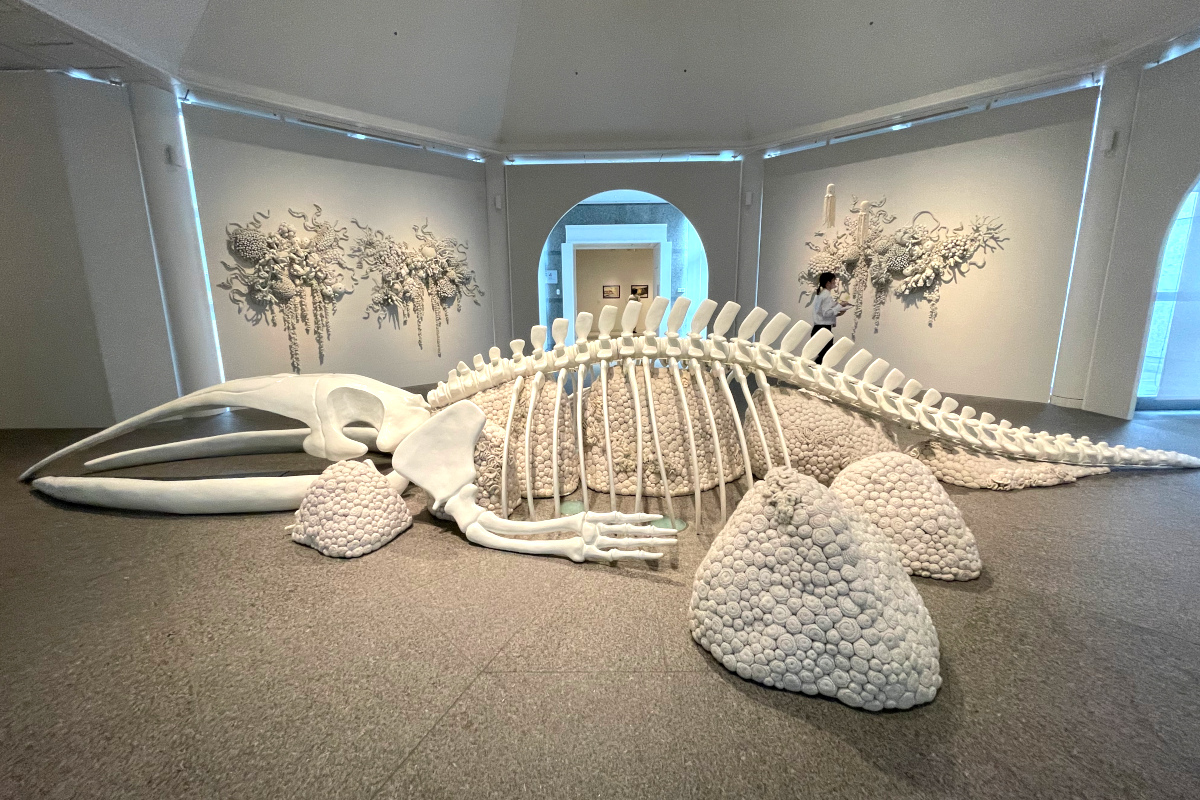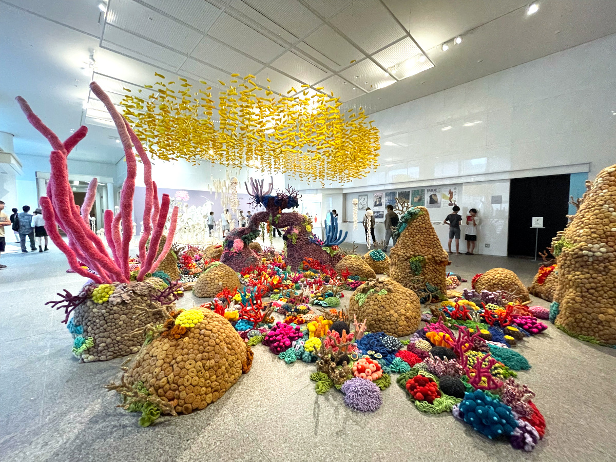 愛知芸術文化センターの会場10階に入ってすぐに目に入るのは、ムルヤナ(マングモエル)のカラフルな生物たち。ムルヤナはアルバイトをしていた時に編み物にのめり込み、毛糸や布を使って制作するようになりました。本展の《海流と開花のあいだ》では、記憶の中にある理想的な海をつくりだし、色鮮やかな珊瑚や魚たちを温かみをもって表現しています。一方で、カラフルな海を通過すると、温暖化による死の海を想像させる白い世界が。海の豊かさと共に、向き合わなければならない問題を示すようでした。
