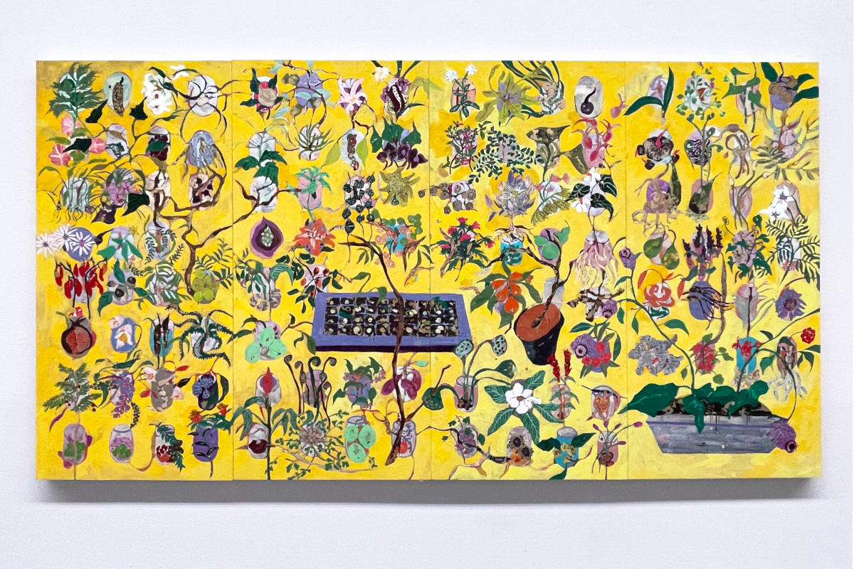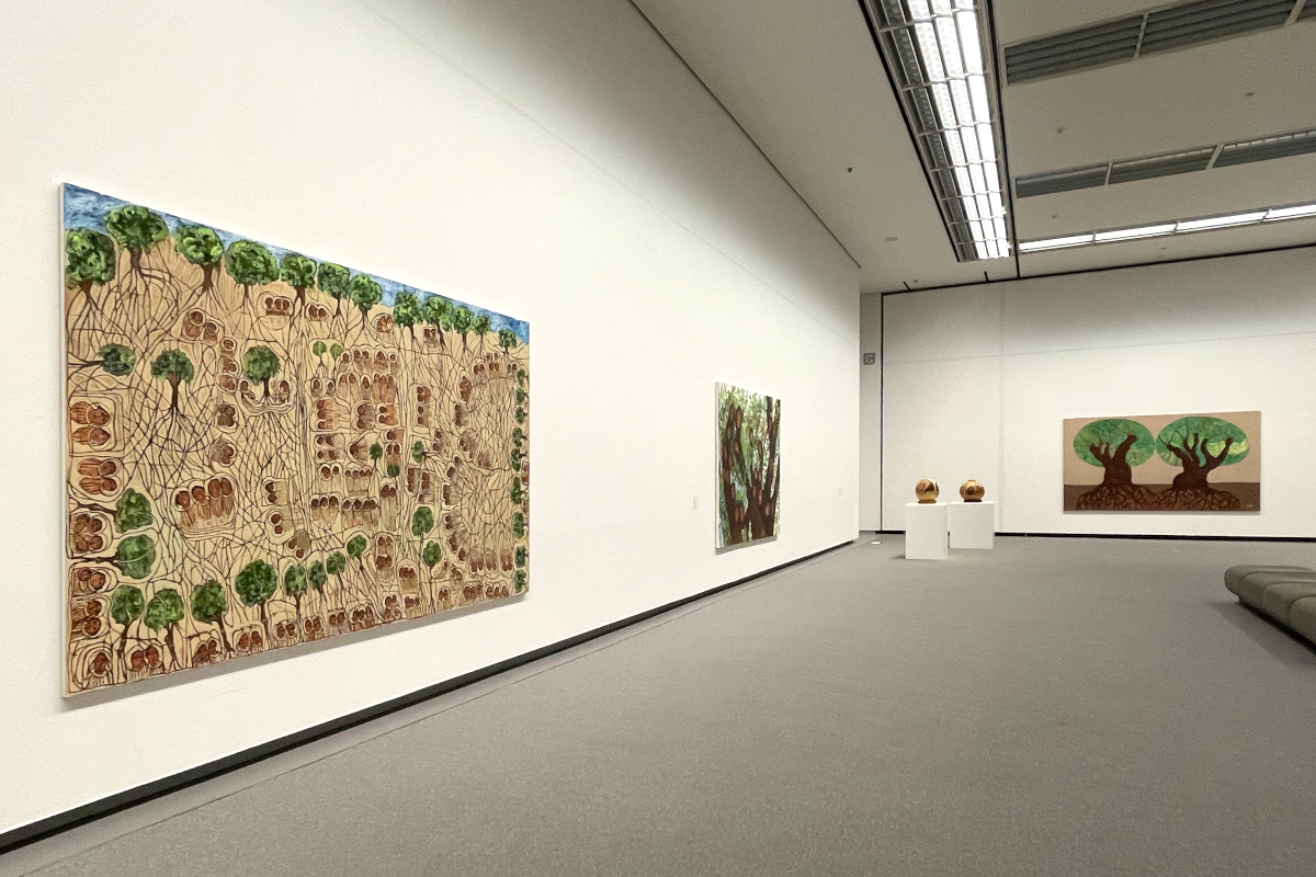 カマラ・イブラヒム・イシャグと浅野友理子は、植物をテーマとし、自然の関係性や生命の循環を連想させる力強い作品を提供しています。カマラ・イブラヒム・イシャグは育ったスーダンの伝統的な美意識に異を唱え、女性に対する支配や束縛をなくすために活動している先駆的なアーティストです。浅野友理子は食文化や植物の利用方法を学ぶために様々な土地を来訪し、記録を絵画化しています。
