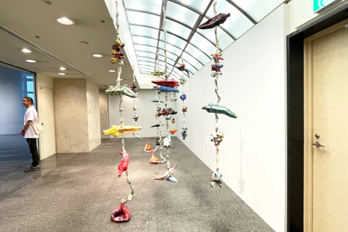 愛知芸術文化センター内の旧レストランを活用した展示も。旧レストランのホールにあるミルナ・バーミアの《サワー・コード》はトウガラシやオクラ、ニンニク、クローブを模した陶器のオブジェを吊り下げた作品。食材の中にはパレスチナの詩人の詩句や護りの象徴である目が描かれたものもあります。
