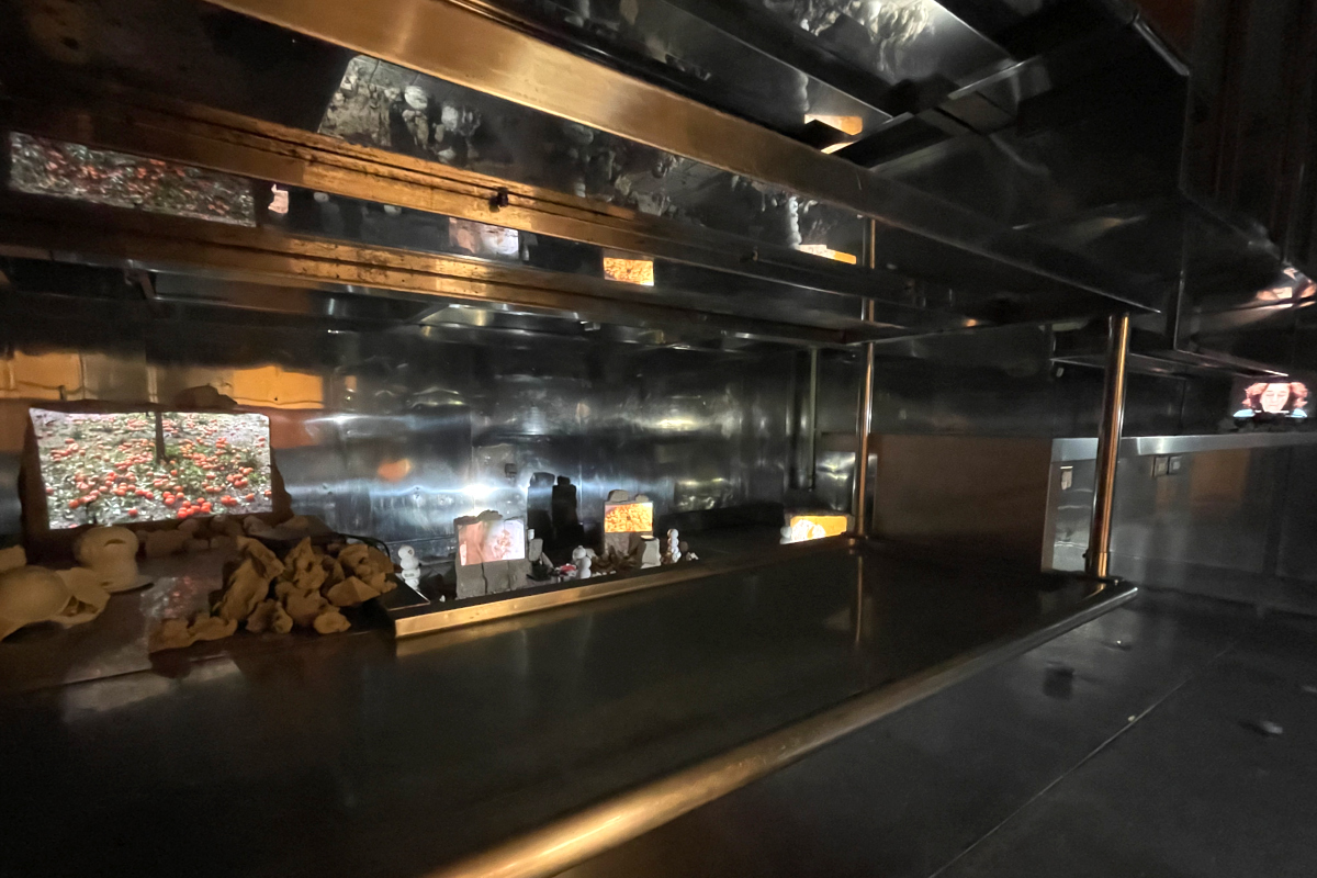 キッチンの《ビター・シングス:オレンジの名のもとに》は、同じくミルナ・バーミアの作品で、喪失や亡命、抵抗を象徴する苦いオレンジから港町ジャッファの甘いオレンジへと至る物語を示す映像と、ジャッファ・オレンジの陶器の彫刻で構成されます。レストランの残り香が漂う空間で、嗅覚と記憶との相性の良さを実感しながら鑑賞できる空間でした。