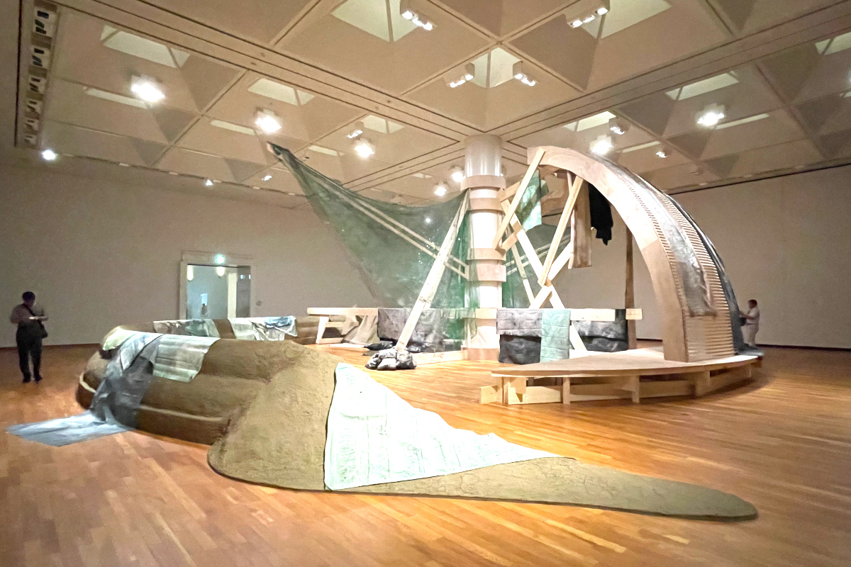 戦争と記憶といったテーマを広い手法で探求するダラ・ナセル。今回出展されている《ノアの墓》は、旧約聖書における「ノアの箱舟」の物語を現代の文脈で解釈するもので、土を固めた壁などはレバノンの墓、ドームはヨルダンの墓、土嚢袋はトルコの墓と、ノアの墓があるとされる三つの地域を示し、円環状の形は自分の尾を飲み込むウロボロスを象徴しています。各地で取った拓本と日本の藍染の布は、土地の記憶を織り込んでいるかのようです。紛争や衝突を連想させつつも、希望も予感させる作品でした。