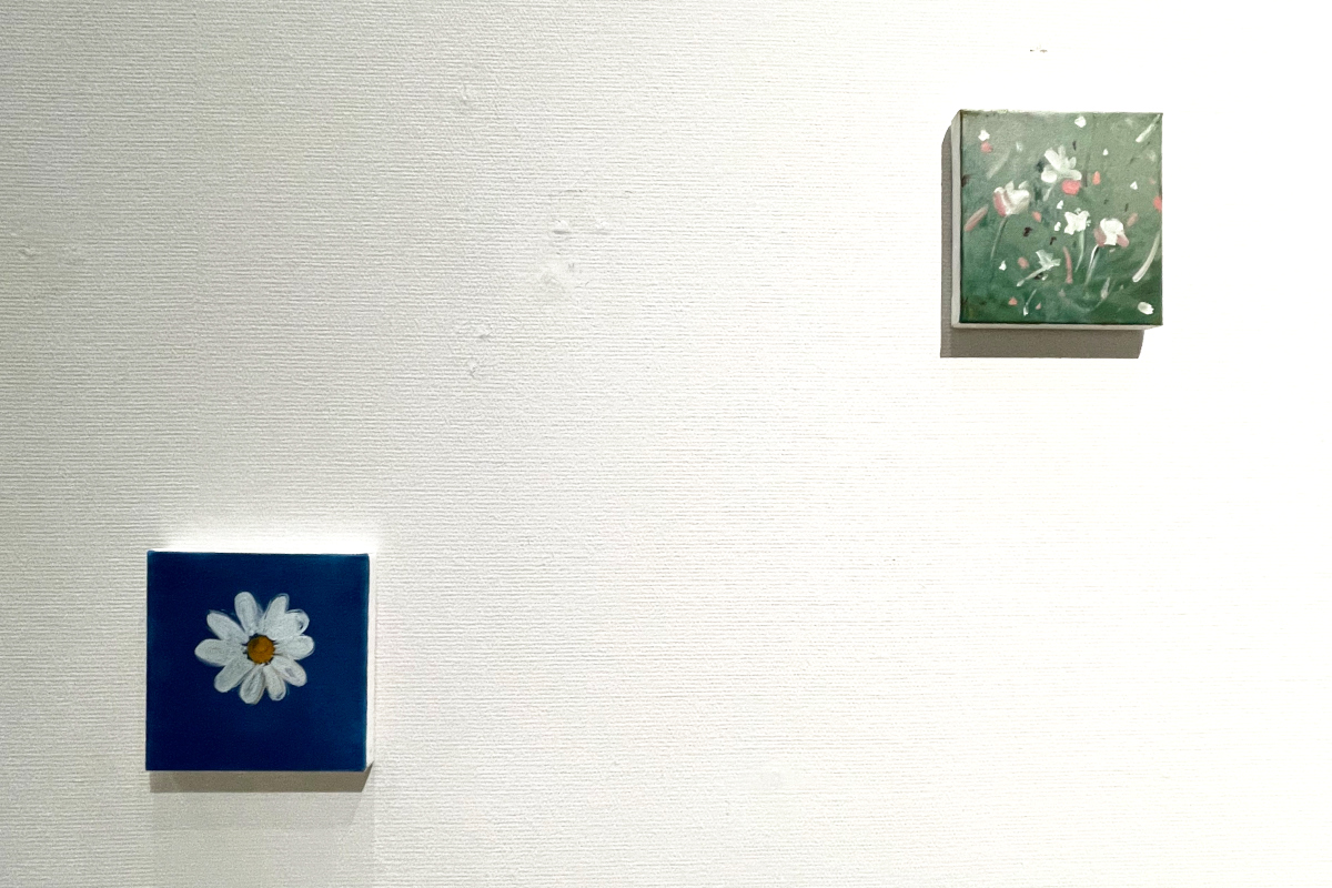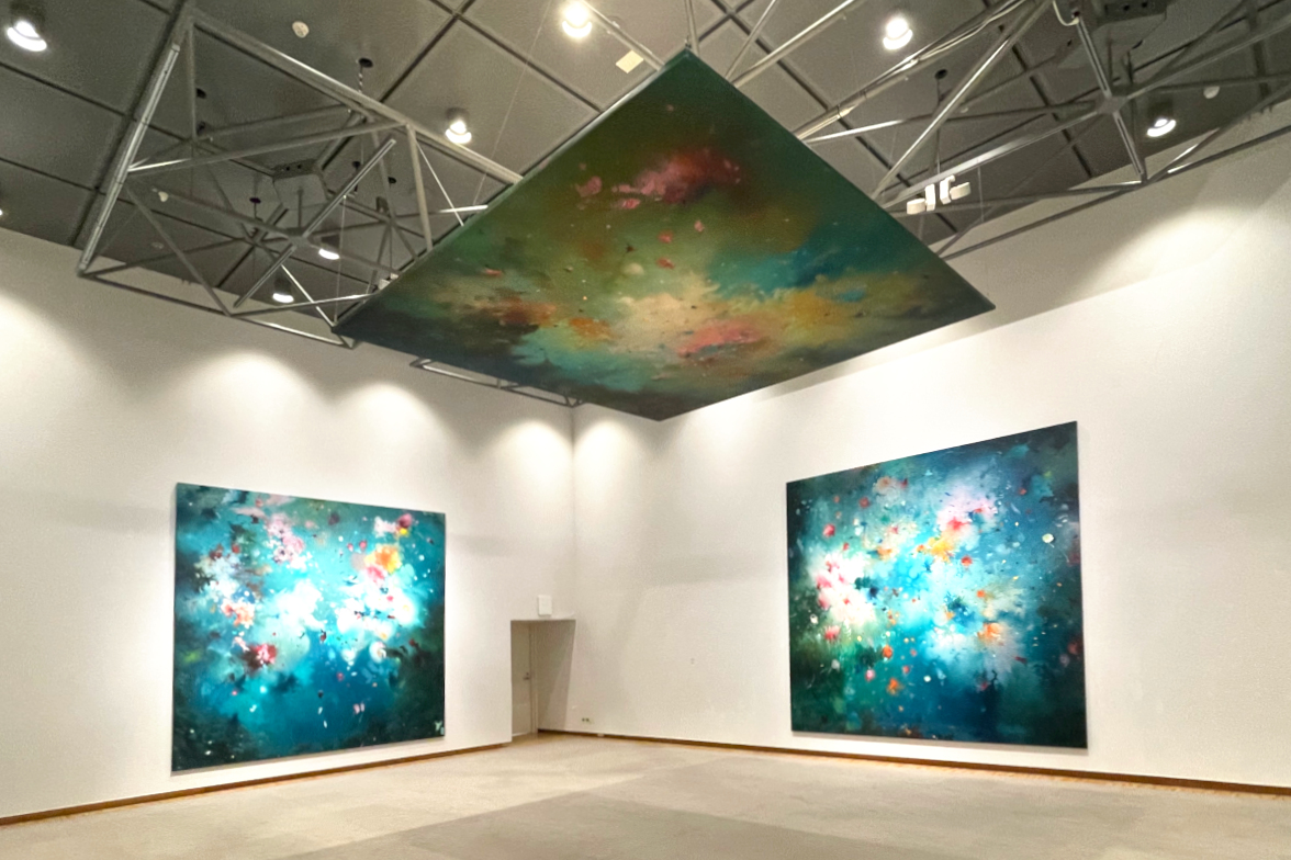 天井絵と壁画のような大型の絵画で構成されているのは、イラク出身で現在はアメリカを拠点に活動するバーシム・アル・シャーケルによる作品。2003年のイラク戦争における爆撃の際に目撃した光景を描いた〈4分間〉シリーズの一部で、下から見上げると空爆された空のようにも見えます。描かれているのは死ではなく爆発のあとの刹那で、新しい始まりを示し、破壊と共に希望を感じさせます。新作の小型作品には鮮やかな色彩で花々が描かれて、つつましくも明るい未来を象徴するかのようでした。