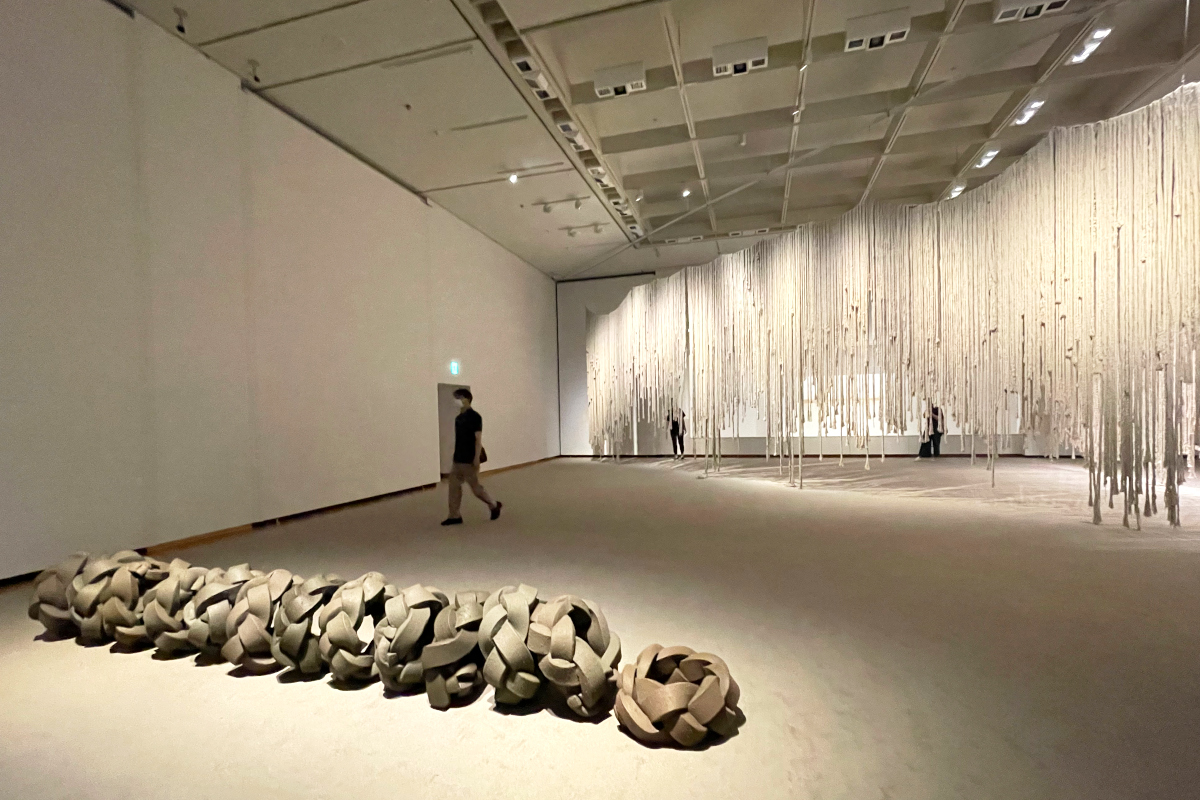 手前:アフラ・アル・ダヘリ《スプリットエンズ(枝毛)》 奥:アフラ・アル・ダヘリによるロープで区切られた空間