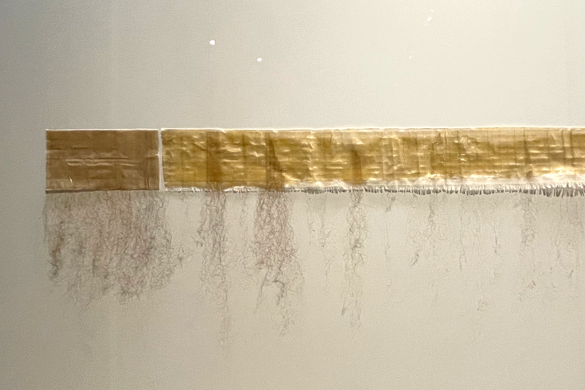アフラ・アル・ダヘリの作品は、美容師として働きながら美術を学んだ作家のキャリアが生きています。セメントを使った《スプリットエンズ(枝毛)》は、ものごとの始まりと終わりや、始まりに至る時間と空間を示します。天井から垂れ下がるロープで区切られた空間は、体を動かすことで作品を肌で感じられるように意図しているとのこと。集めた髪をテープで留めて伸ばす《一本ずつ―<解きほぐす>シリーズより》は、髪の繊細さや力強さを示しています。