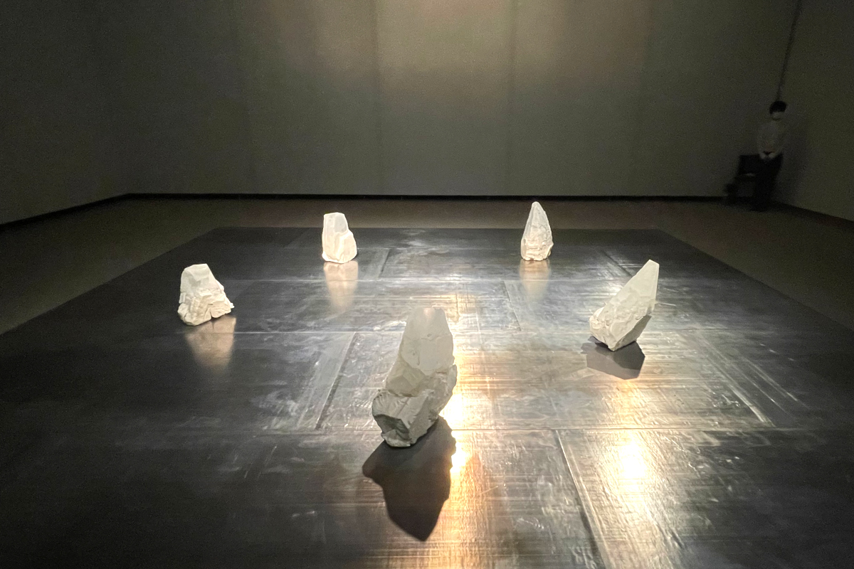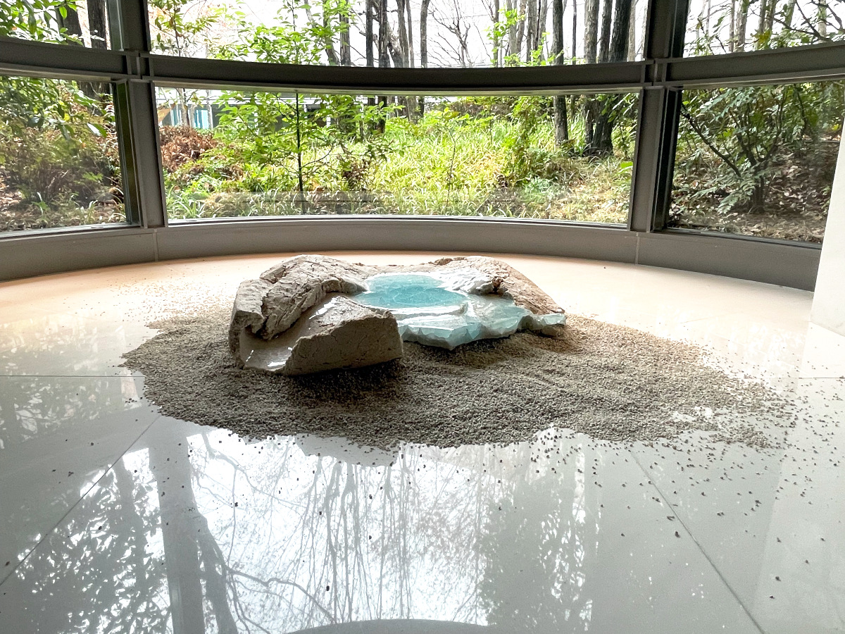 ガラスや磁器土の性質を活かした小川待子の作品は硬質かつ静謐で、見入ってしまう美しさがあります。水が今にも零れ落ちそうにも、天からの恵みを湛えているようにも見える《水盤》は、作品の水色がガラス越しの空を閉じ込めているような詩情が漂います。〈記憶と結晶〉シリーズは磁器土とガラスが融合しており、時間を閉じ込めた結晶を掘り起こしたような壮大なスケールを感じさせる作品でした。