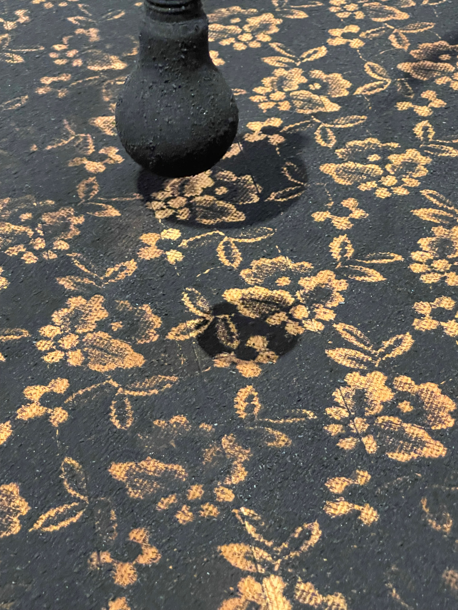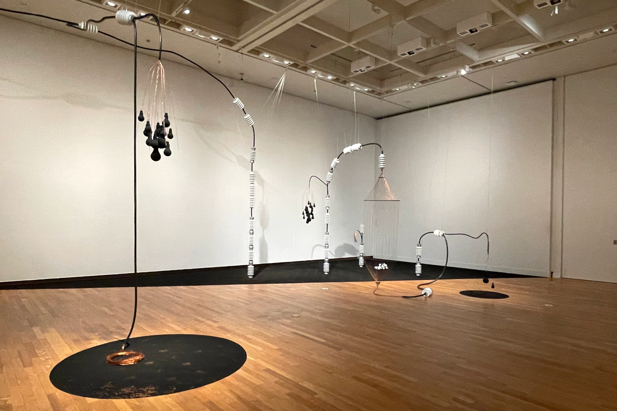 漆黒の墨が花柄の布のように床へ広がっているのは川辺ナホの作品。石炭の主要産地である福岡県で生まれた川辺は、木から水蒸気などが抜けて炭素が残った炭でインスタレーションを展開、今回は近代以降のエネルギー産業の要である「碍子(がいし)」に注目し、碍子や炭、電線や日常的なものを使って人間と炭の関係性を表現しています。