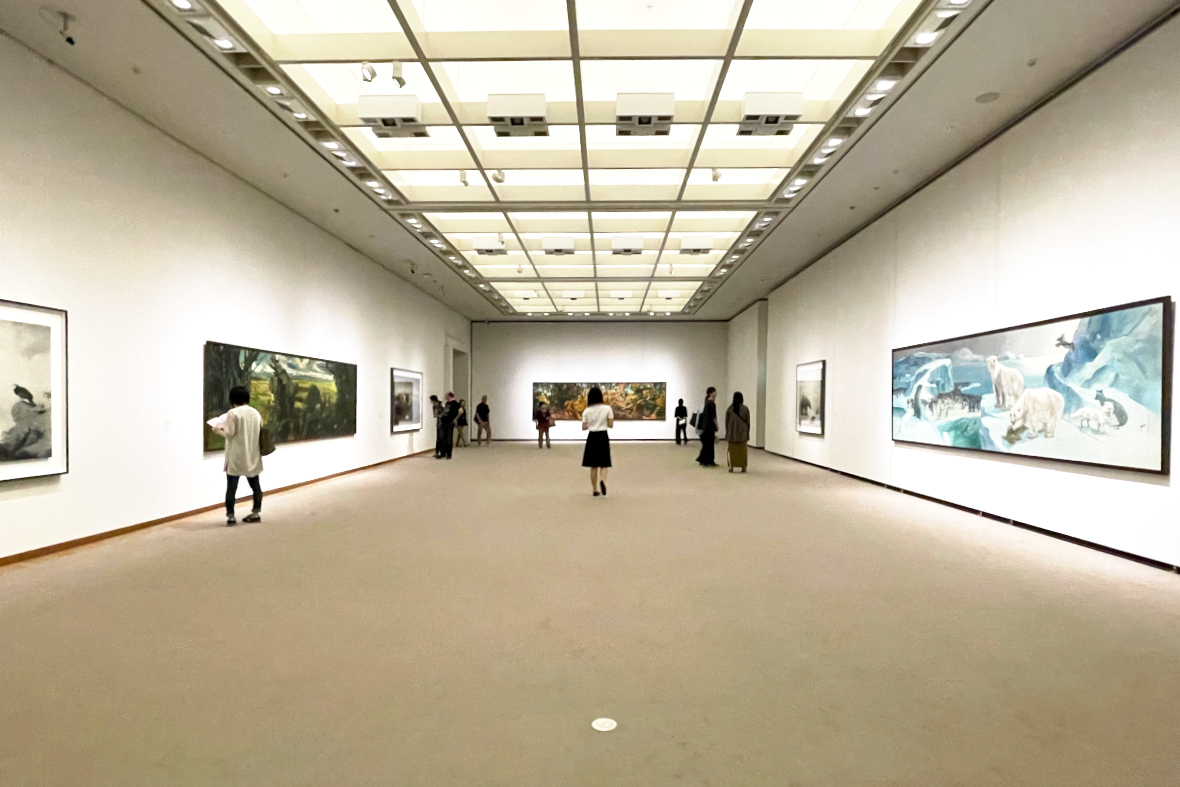 動物にまつわる平面作品が結集しているエリアも。戦時における名古屋市東山動物園で行われた猛獣の殺処分の後、水谷清、太田三郎、宮本三郎は、猛獣がいない寂しさを補おうと発案された「猛獣画廊壁画」を手がけました。同じ空間では、杉本博司がアメリカ自然史博物館などのジオラマを撮影し、写真のなかで動物たちの生を取り戻そうと試みた〈ジオラマ〉シリーズを鑑賞できます。