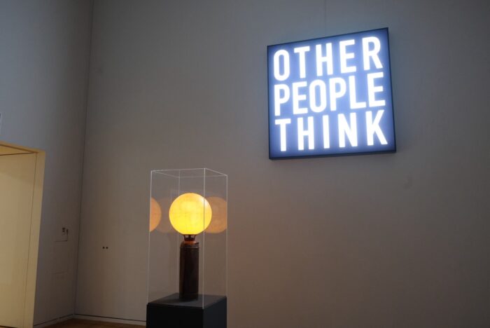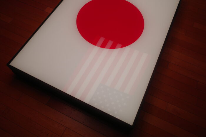 また本展では、新作《明日は明日の陽が昇る》(2025)も公開されている。「日本がなぜこれほどアメリカに依存しているのか、完全には理解できない」と語るジャーは、日本の国旗を映すライトボックスの上に、向かい合うように同じくライトボックスでアメリカの星条旗を配置。日本の国旗に星条旗が映り込むことで、両国の関係を考えさせられる作品となっている。