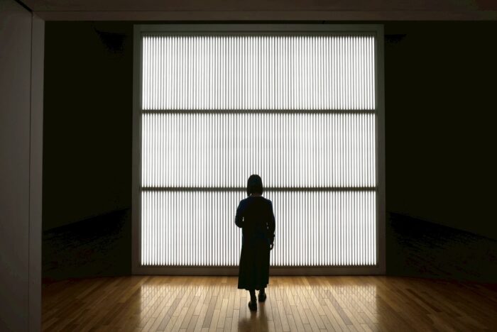 最大の展示室Dは、入口で思わず目を細めるほどの強烈な光に包まれる。約250m3の巨大なボックス《サウンド・オブ・サイレンス》(2006)は、8分間の映像を上映するインスタレーション作品だ。