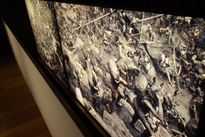続く展示室Bの、ブラジルの金鉱を題材にした「ゴールド・イン・ザ・モーニング」シリーズでは、1985年に現地で目撃した貧困層の過酷な労働が記録されている。特に興味深いのは、写真を鏡に反射させて映し出した作品だ。鑑賞者が自ら鏡を覗き込まなければ見えない仕組みになっており、「社会が過度にナルシスティックになった」と感じたジャーは、自分を映す鏡を、他者を見る装置へと転換させた。