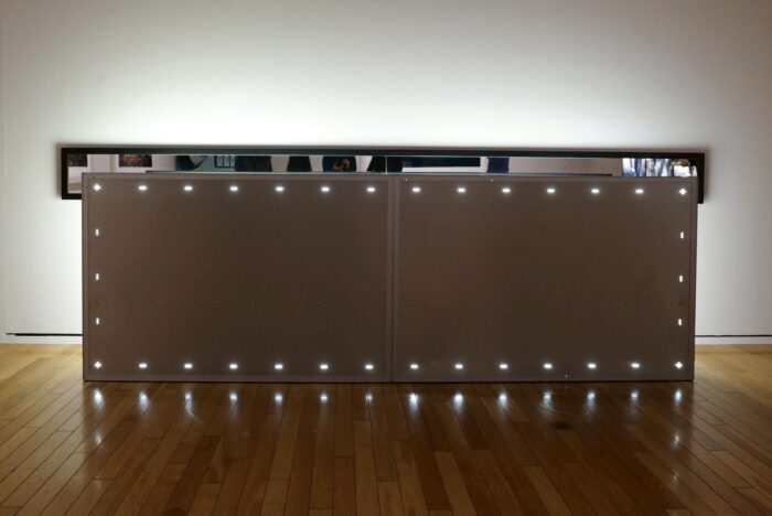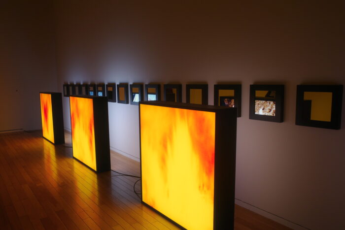 この手法をさらに発展させたのが、次の展示室Cにある《エウロパ》(1994)である。ボスニア紛争をテーマにしたこの作品では、鏡の前に炎を思わせるライトボックスが置かれ、その裏には現地の人々の写真が隠されている。身体を動かさなければ全体が見えないこの仕掛けは、遠い地の悲劇にも目を向けて考えるべきだという、ジャーの一貫した姿勢を体現している。