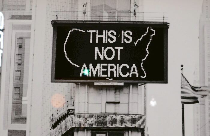 6つの展示室では、世界各地の社会問題を反映した四大陸が示唆されている。、最初の部屋(展示室A)にはジャーがニューヨーク移住直後に制作した初期作品が展示されている。タイムズ・スクエアで上映された《アメリカのためのロゴ》(1987)は、彼がアメリカで感じた違和感を表現した作品だ。「アメリカとは本来、南北大陸全体を指す言葉のはずなのに、合衆国の人々は自分たちだけを『アメリカ人』と呼び、ラテンアメリカの存在を見えなくしている」。作品は大陸地図とシンプルな言葉で、“アメリカ”という言葉が持つ本来の意味の広がりを問い直している。